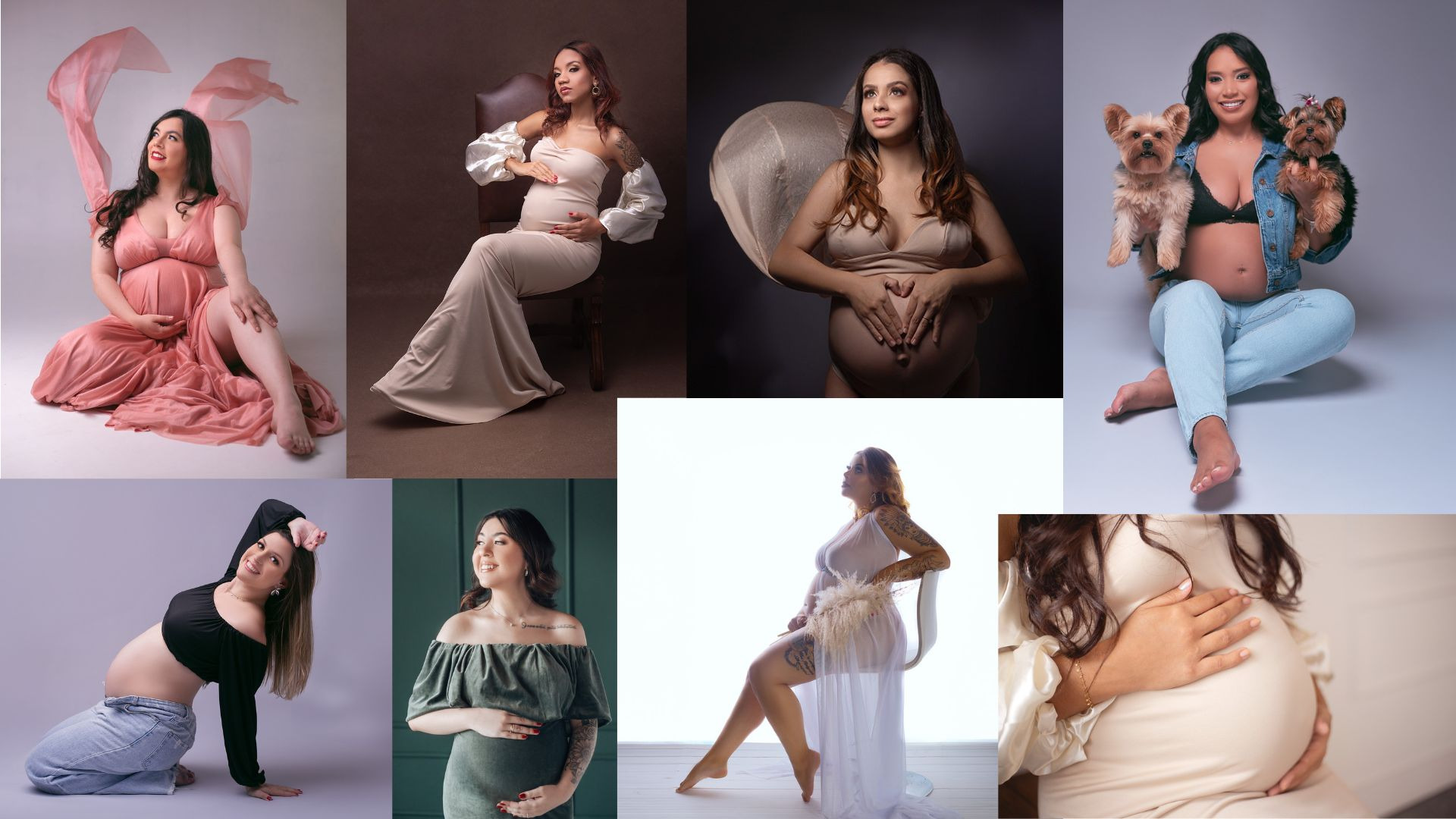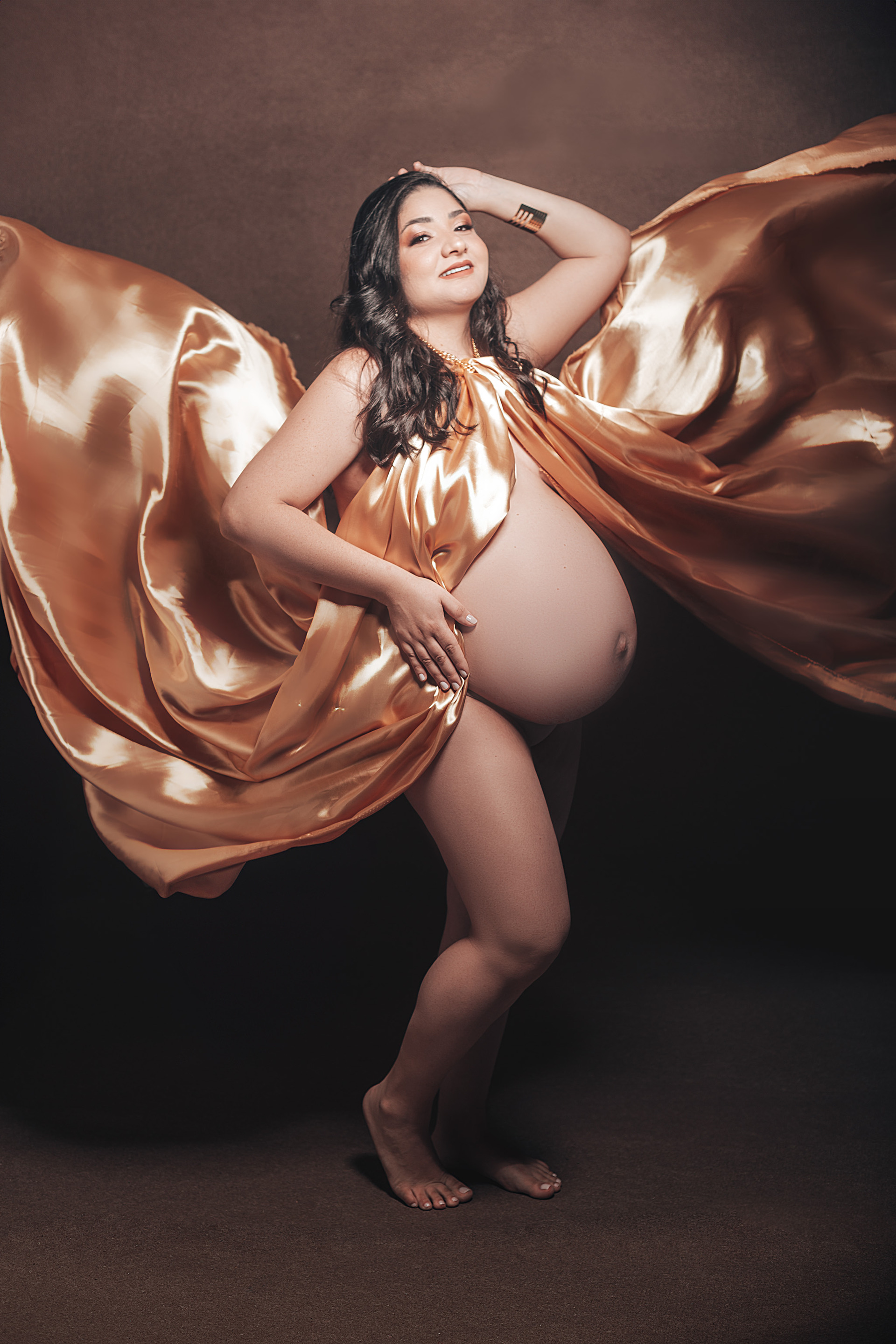 Não se preocupe com nada! O Studio Thami's possui um acervo exclusivo de figurinos de luxo, incluindo vestidos, tecidos fluidos e peças casuais que valorizam o corpo da gestante. Tudo já está incluso no seu pacote.